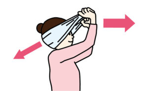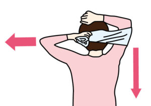 2.反対の手でタオルを引くと同時に、肘を下げる。左肘も同様に。
