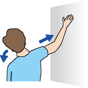 手で壁を押し、腕を外方向に伸ばす。首の筋肉は逆方向に伸ばす。