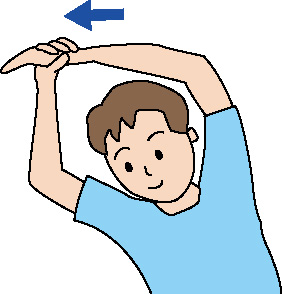 頭上で片方の手を持ち、わき腹から腰にかけての筋肉を伸ばすイメージで引っ張る。